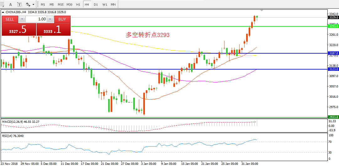小时图看,CHINA300中华指数均线系统呈多头排列,整体走势十分强势。 MACD红柱增加,RSI拐头向上,维持偏多思路。