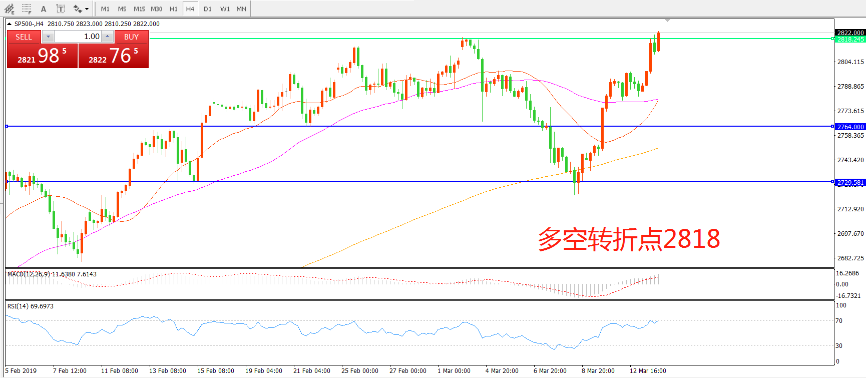 4小时图看,标普500近连续出现反弹,再次冲击2820一线阻力,21均线逐渐上穿形成金叉, MACD红柱增加,RSI指标向上,日内延续上行概率较大。