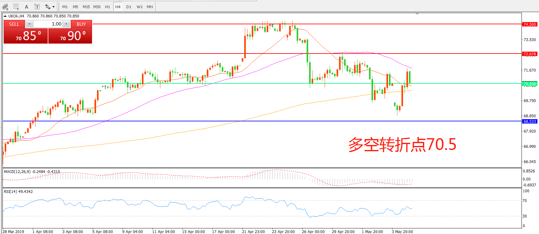 布油收回开盘大部分跌幅,并重新站上70.5一线的多空分水岭。