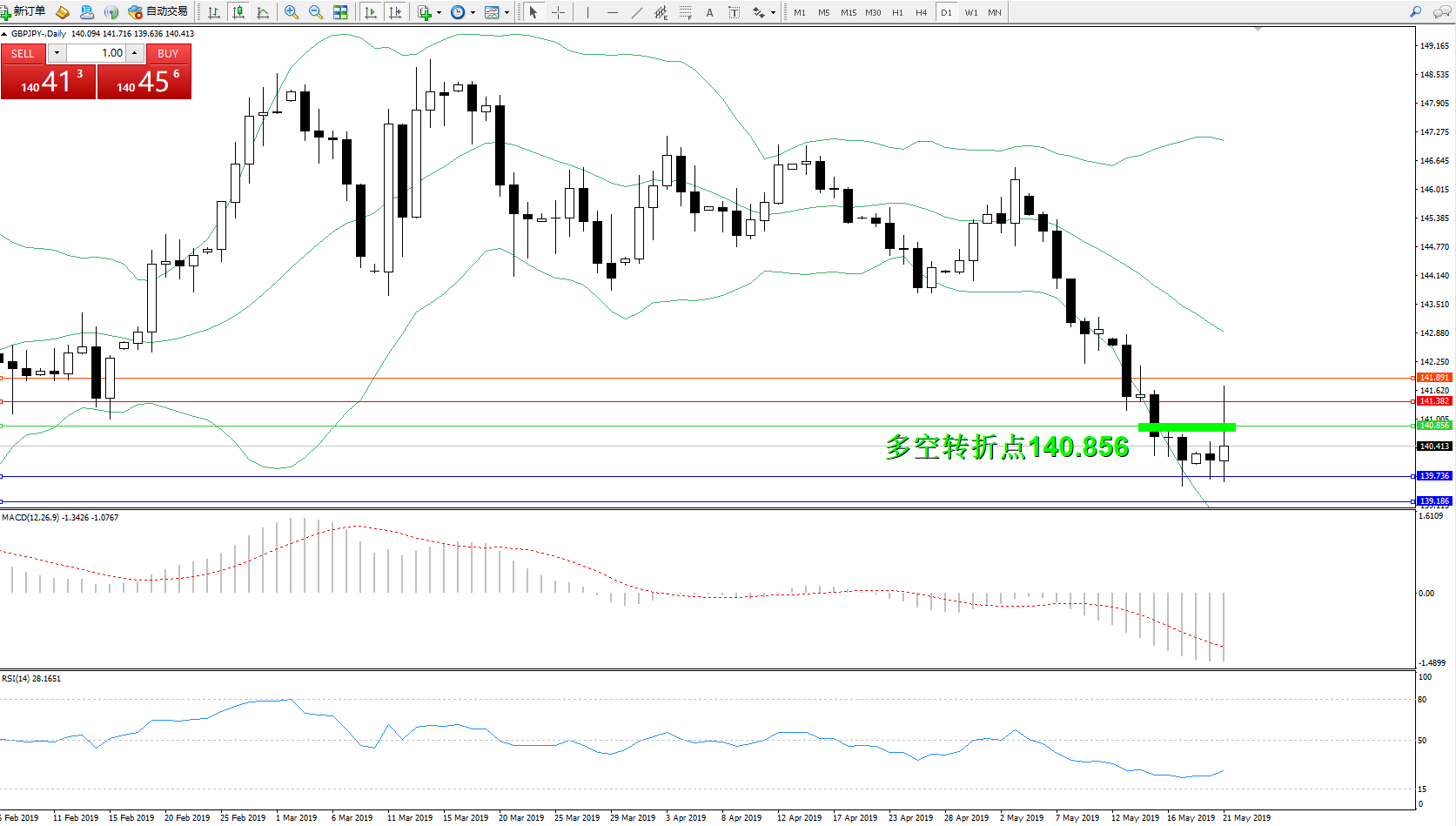 交易策略:140.856下方看跌,目标139.736139.186