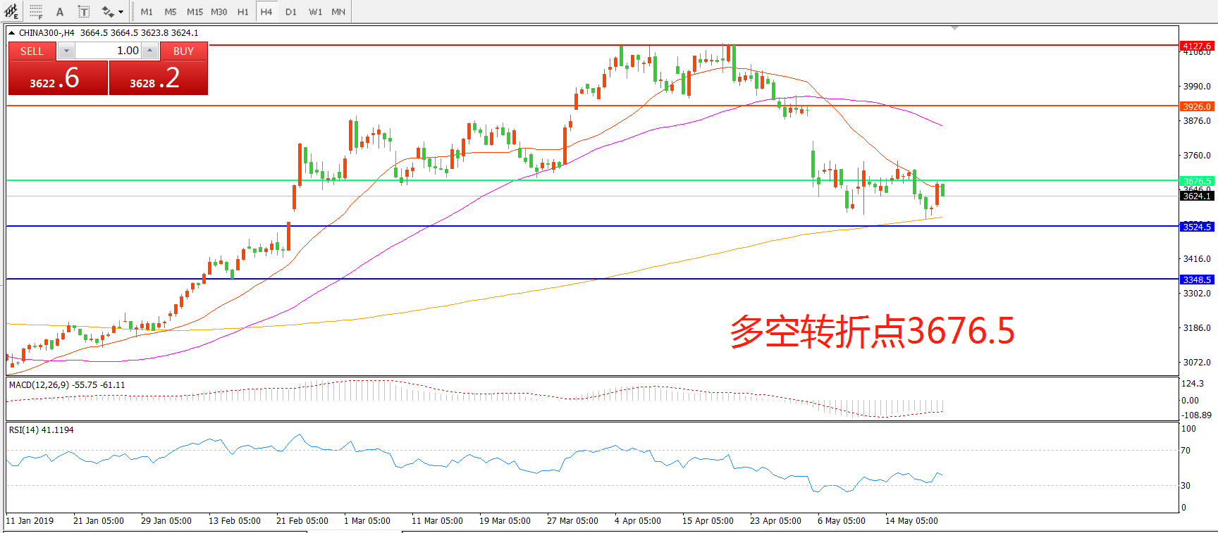 4小时图看,沪深300指数在跌破3676.5整理后震荡下行, 200均线成为短期支撑,MACD绿柱缩短,RSI指标拐头向下,日内以震荡下行思路对待。