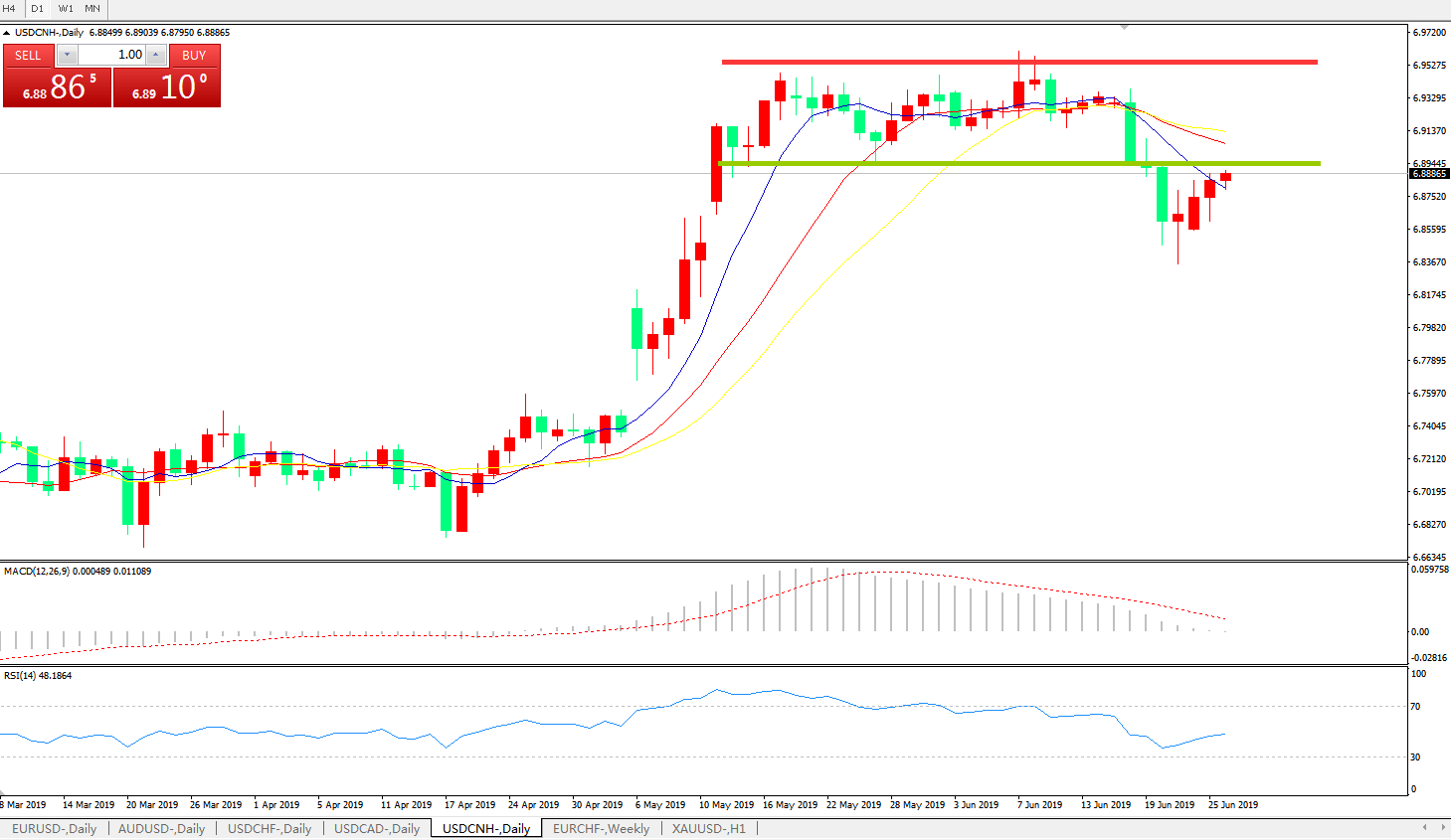技术面简析:日线呈有序空头排列MACD逼近0轴且动能柱绿柱开始显现RSI开始反弹走高,贸易争端缓解预期犹在,G20临近,预计汇价大概率将进一步走低