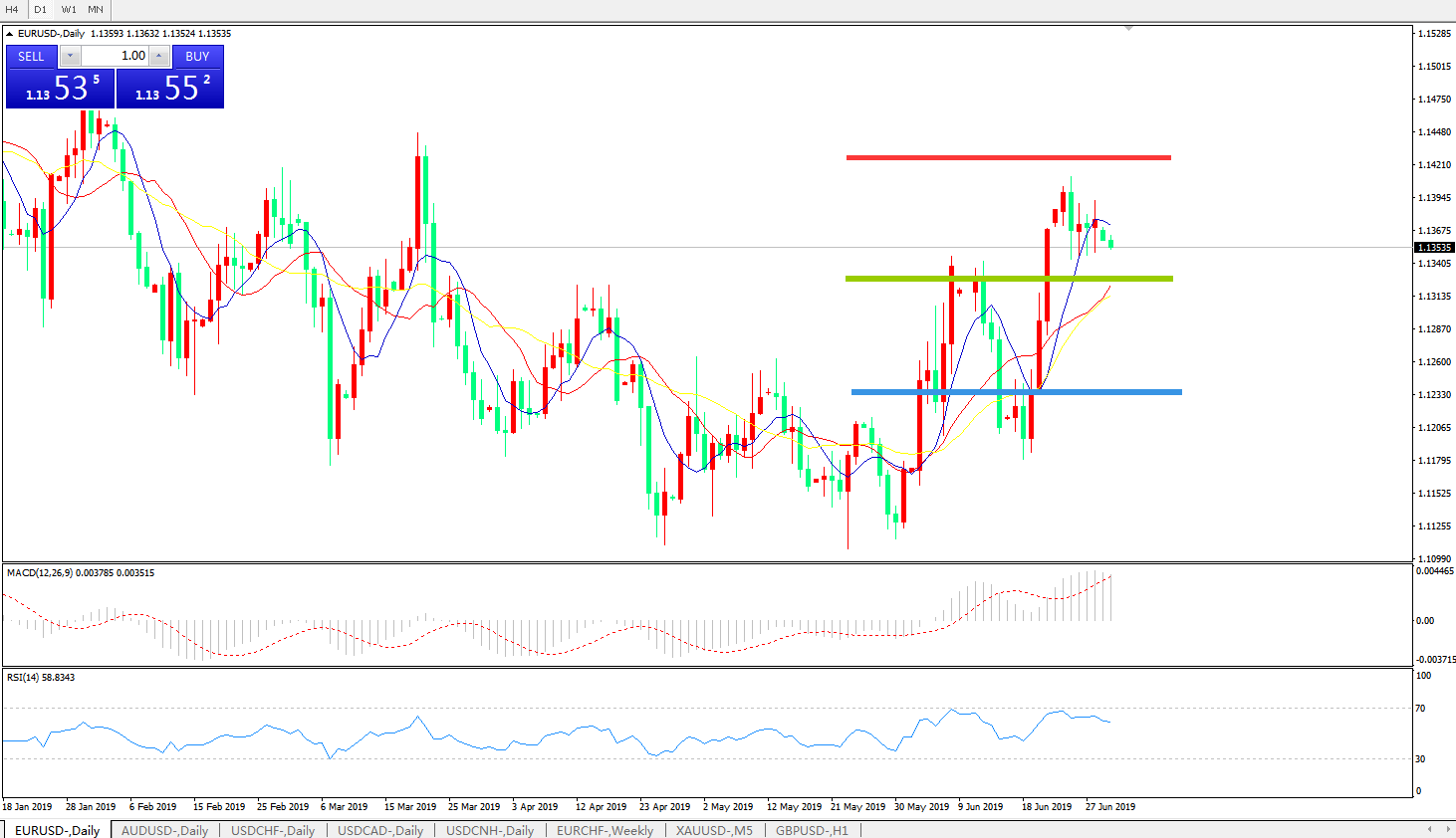 周(628日)欧洲时段,欧元美元走高0.1%1.1380,此前法国欧元区通胀数据意外走强,且投资者在G20会议期间立场观望,令美元指数承压回落,另一方面,欧元区未季调核心CPI年率好于预期,减小了欧洲央行在此后的宽松压力,这也使得大家对欧洲央行加速宽松的预期降温。而欧元兑美元货币对的后继走势仍取决于美欧央行在宽松货币政策竞赛中的步伐,因此,下周集中出炉的欧美PMI数据,连同美国6非农报告,将决定汇价的下一步走势方向。更多可能促进美联储超预期降息的经济负面新闻将推动欧元兑美元真正站上1.14关口。