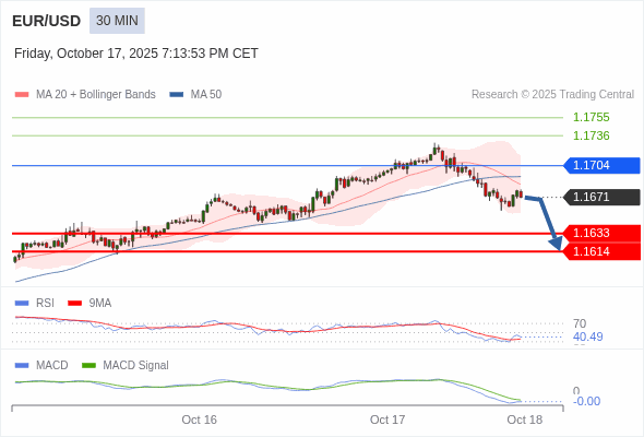 欧元/美元 当日内 : 看跌,在 1.1704 之下。