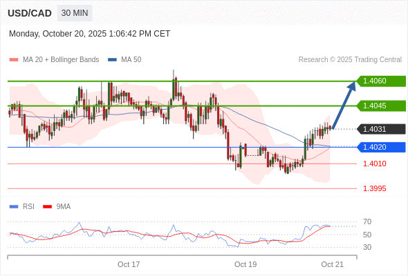 在 1.4020 之上,看涨,目标价位为 1.4045 ,然后为 1.4060 。