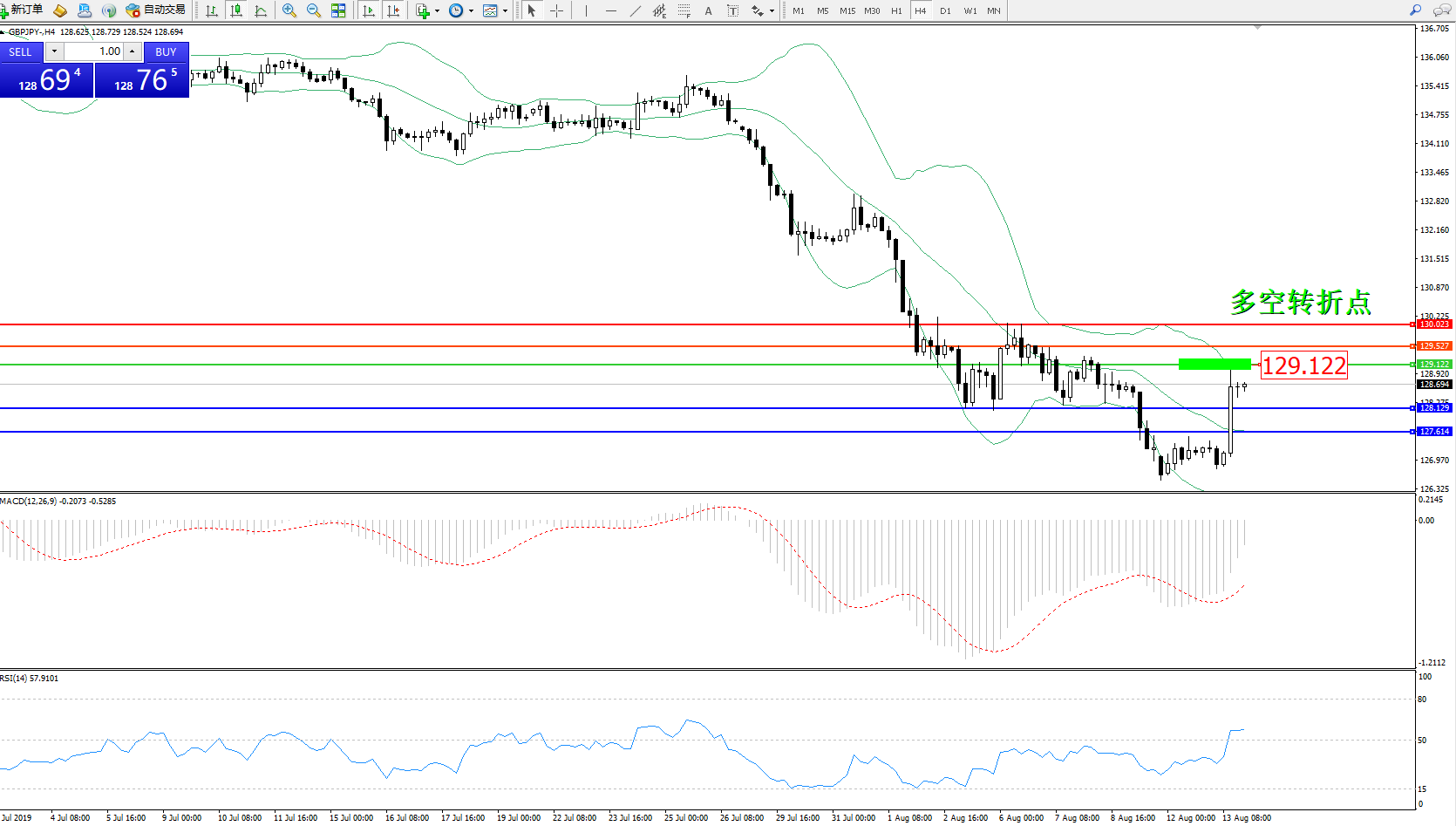 交易策略:129.122下方看跌,目标128.129127.614