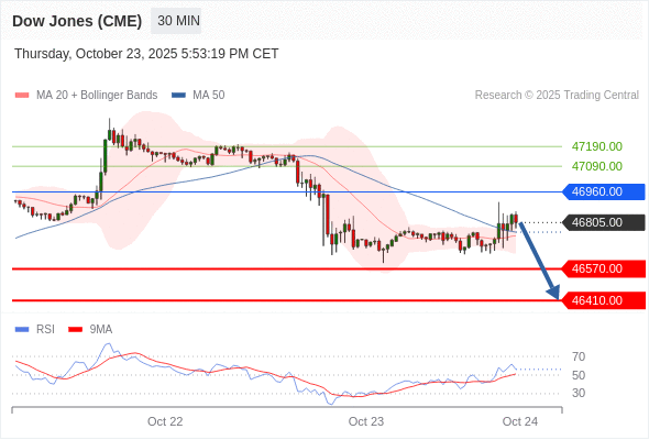 美国道琼斯指数期货 (Z5) 当日内: 短期关键阻力位在46960.00。