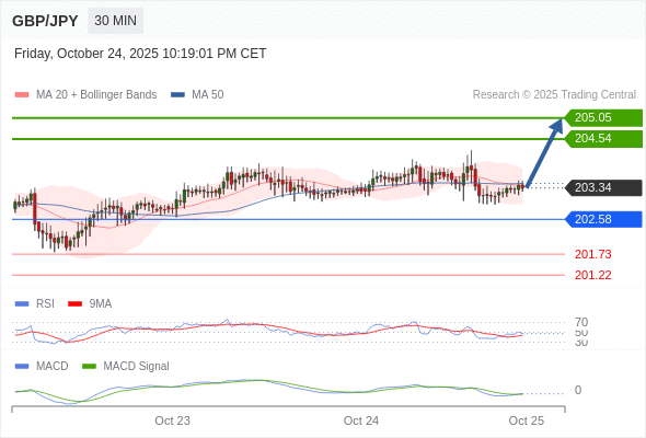 英镑/日元 当日内: 有上涨的可能,目标价位定在 205.05 。