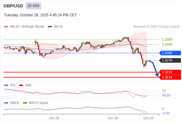 英镑/美元 当日内 : 看跌,在 1.3306 之下。
