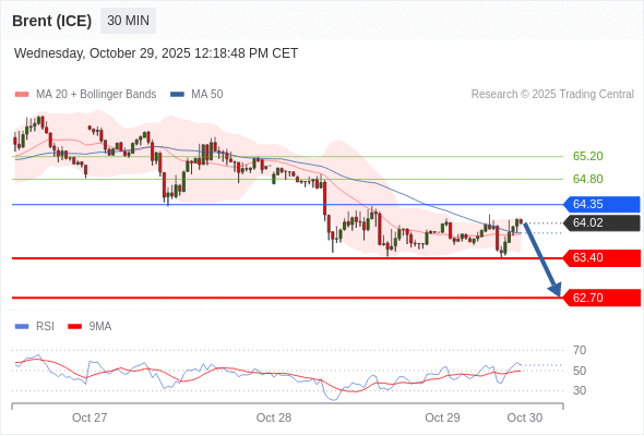 在 64.35 之下,看跌,目标价位为 63.40 ,然后为 62.70 。