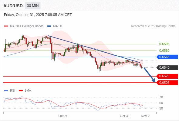 交易策略: 在 0.6565 之下,看跌,目标价位为 0.6520 ,然后为 0.6505 。