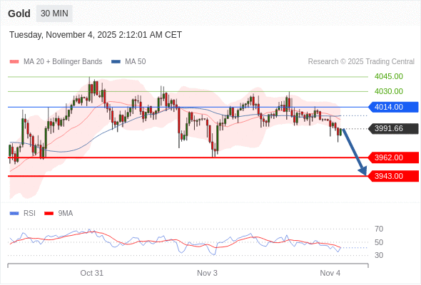 在 4014.00 之下,看跌,目标价位为 3962.00 ,然后为 3943.00 。