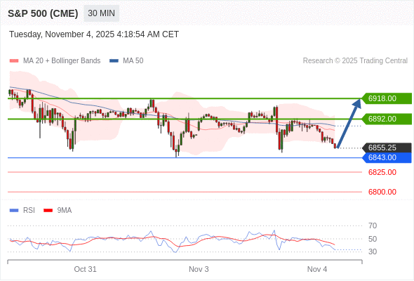 交易策略: 在 6843.00 之上,看涨,目标价位为 6892.00 ,然后为 6918.00 。