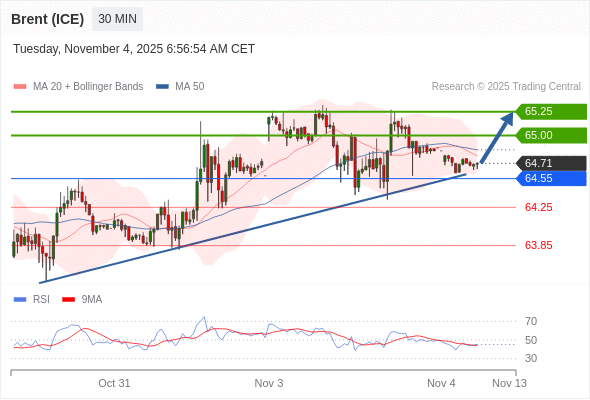 在 64.55 之上,看涨,目标价位为 65.00 ,然后为 65.25 。