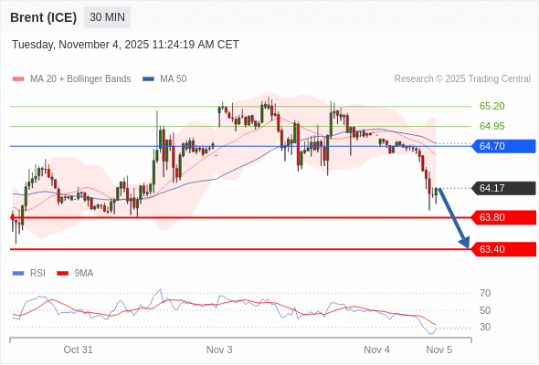 交易策略: 在 64.70 之下,看跌,目标价位为 63.80 ,然后为 63.40 。