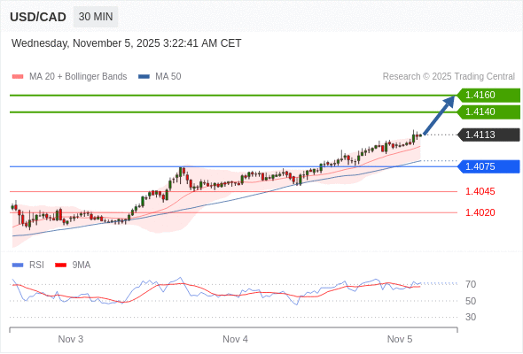 在 1.4075 之上,看涨,目标价位为 1.4140 ,然后为 1.4160 。