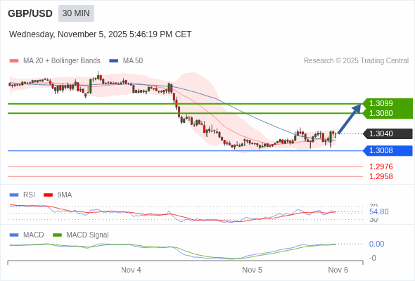 英镑/美元 当日内 : 看涨,当 1.3008 为支撑位。