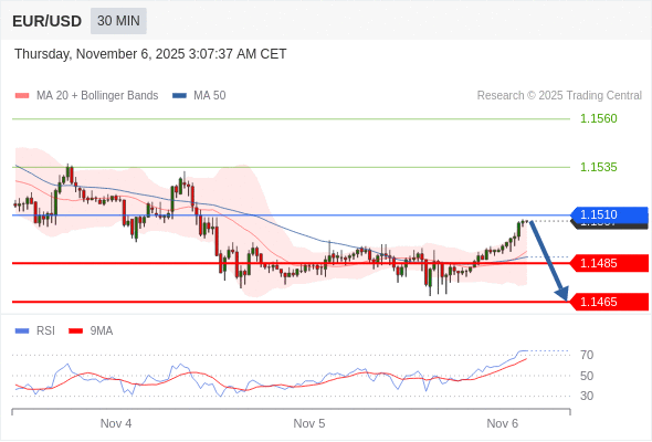 在 1.1510 之下,看跌,目标价位为 1.1485 ,然后为 1.1465 。
