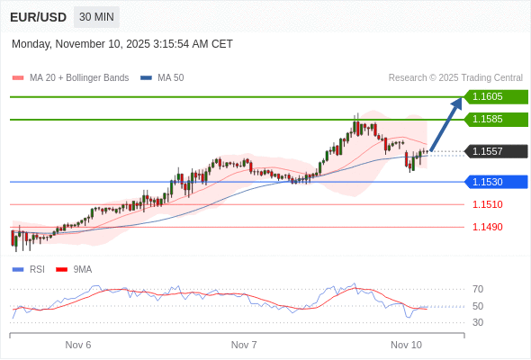 欧元/美元 当日内: 在1.1530之上,看涨。