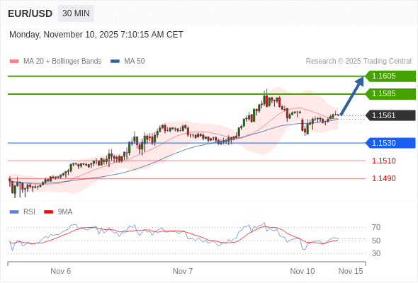 在 1.1530 之上,看涨,目标价位为 1.1585 ,然后为 1.1605 。