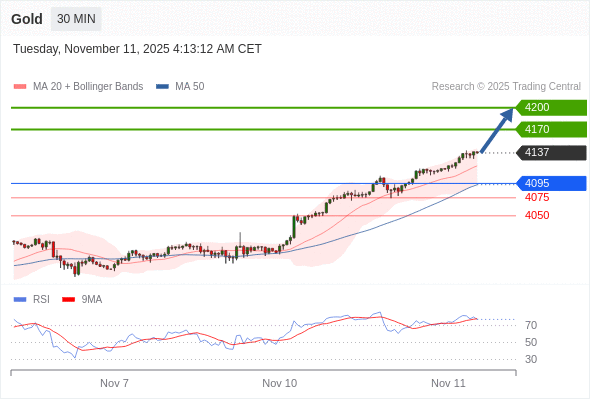 在 4095 之上,看涨,目标价位为 4170 ,然后为 4200 。
