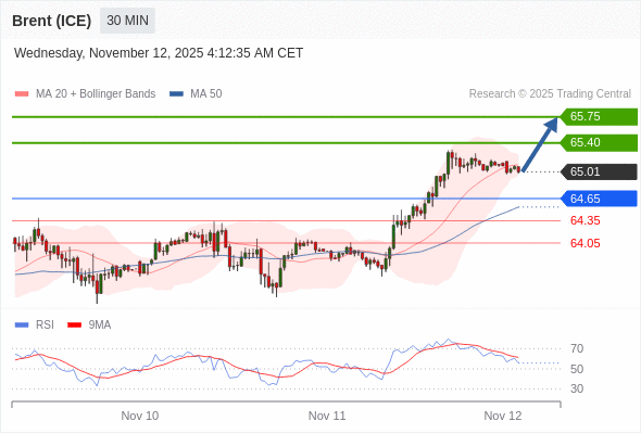 在 64.65 之上,看涨,目标价位为 65.40 ,然后为 65.75 。