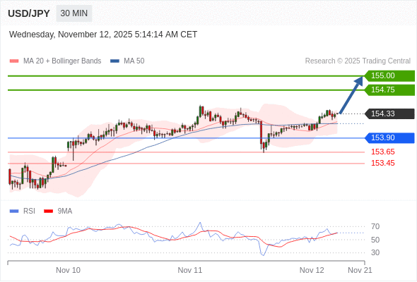 在 153.90 之上,看涨,目标价位为 154.75 ,然后为 155.00 。