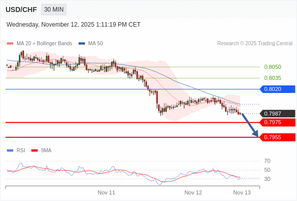 在 0.8020 之下,看跌,目标价位为 0.7975 ,然后为 0.7955 。