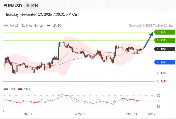 交易策略: 在 1.1565 之上,看涨,目标价位为 1.1605 ,然后为 1.1620 。