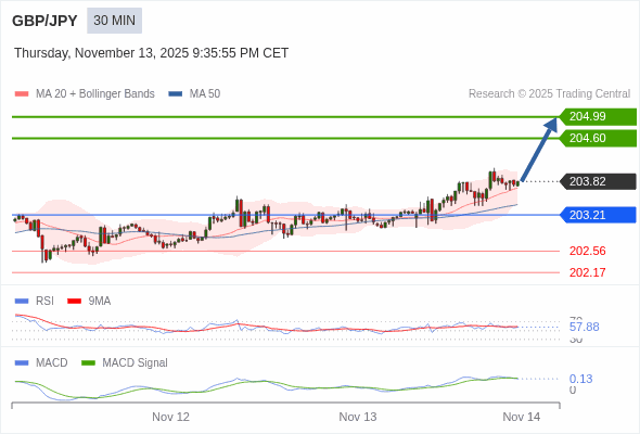 英镑/日元 当日内 : 看涨,当 203.21 为支撑位,目标定在204.99。