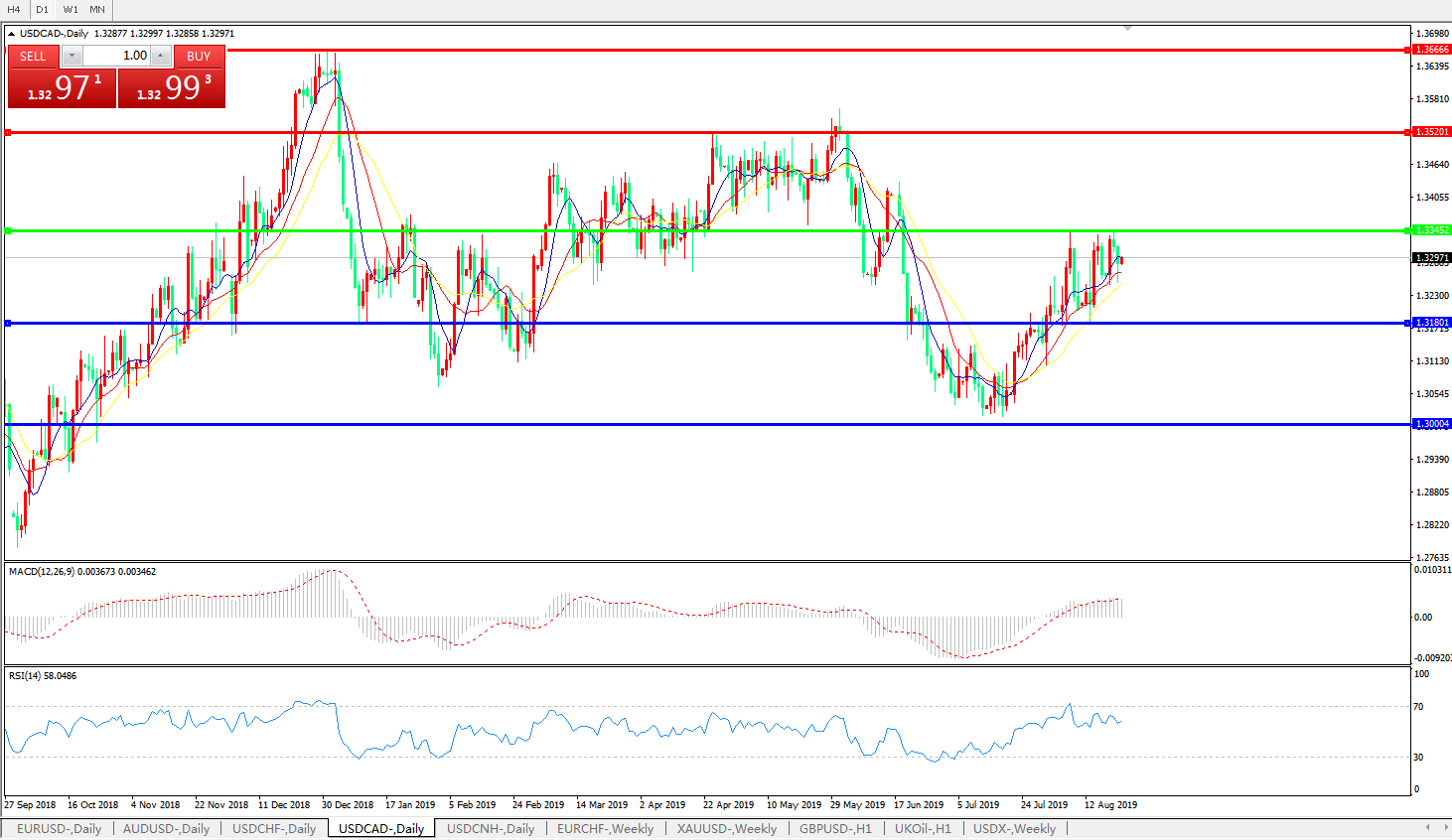 美元兑加元在周三日内承压走低,欧洲时段盘中失守1.33关口,一方面原因在于美元指数在美联储会议纪要即将出炉之际略现颓势,另一方面,油价的持续回升也使得加元走强;全球贸易环境前景自上周末以来略有好转,这使得市场对于未来原油需求增速放缓的顾虑也有所缓和,而这方面的顾虑曾在上周带动油价大跌。与此同时,中东地区局势仍不稳定,美国和伊朗官员本周以来仍在隔空互怼,这使得供给层面的忧虑也再度燃起。油价的持续上涨也令加元汇价在美元指数整体坚挺的本周依旧保持强健,美元兑加元数次上攻1.3345关键阻力位无果后,上升动能暂已耗尽。1.3345水平见顶,目前还不能过早下结论。