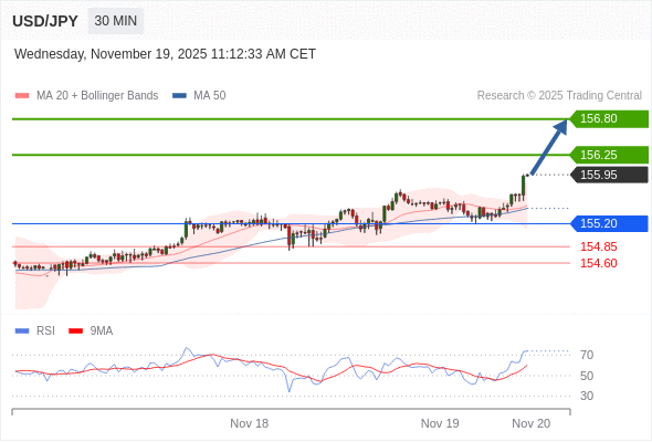 在 155.20 之上,看涨,目标价位为 156.25 ,然后为 156.80 。