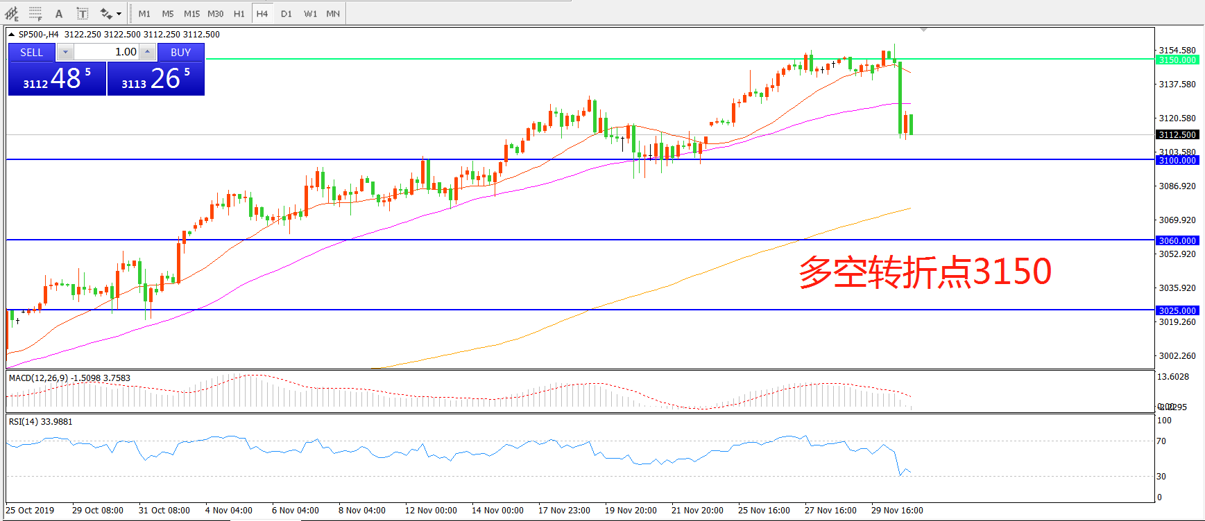 4小时图看,标普500长阴下破,近期涨幅被吞没整,上周形态遭到破坏,均线系统有拐头迹象,MACD红柱减少,RSI指标向下,日内有延续下行可能。