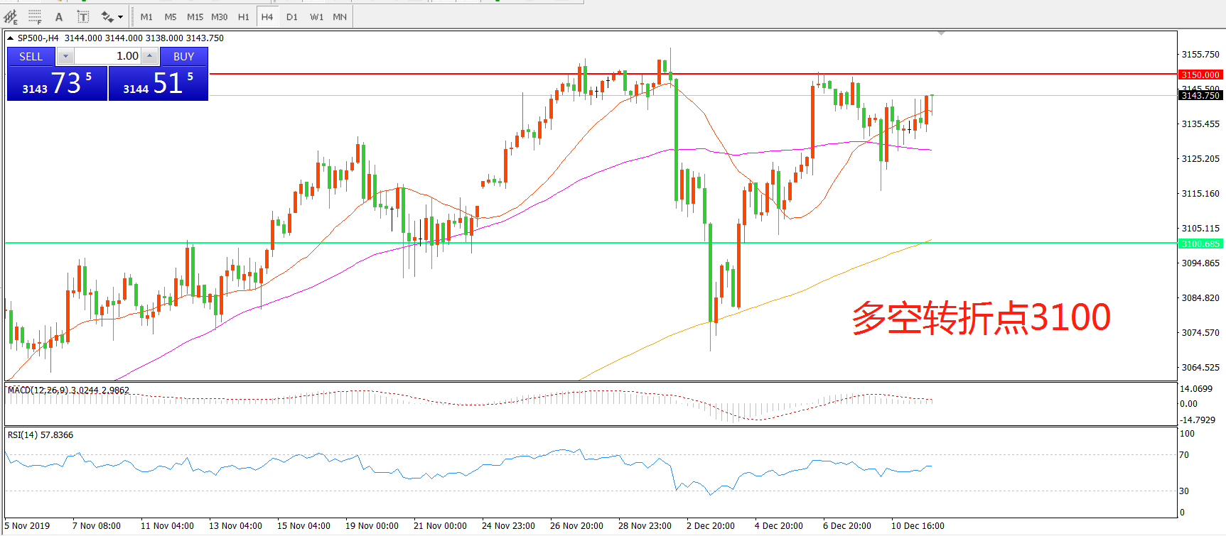 4小时图看,标普整体维持高位震荡,3150阻力在前,55周期均线成为支撑,MACD红柱缩短,RSI指标走平,日内震荡上行概率较大。