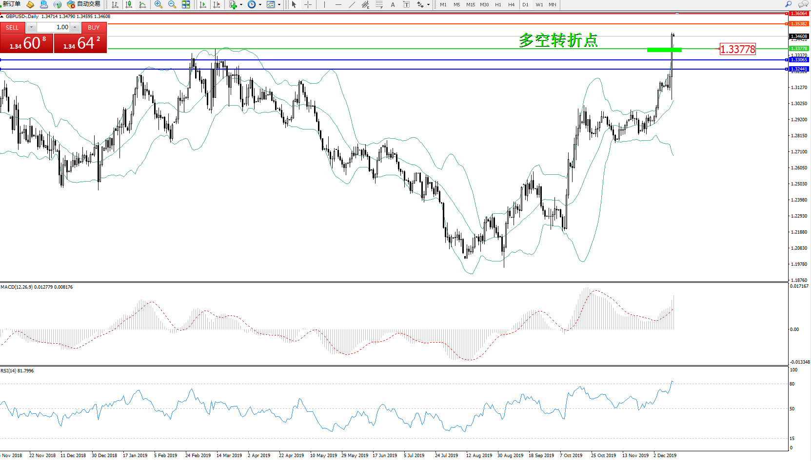 交易策略:1.33778上方看涨,目标1.35382、1.36064