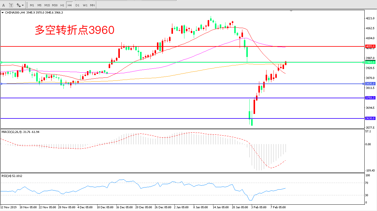 4小时图看,沪深300阳线连续拉升,整体表现强势,3960成为短期多空分水岭,均线系统走平,MACD绿柱缩短,RSI指标走平,日内延续上行概率较大。