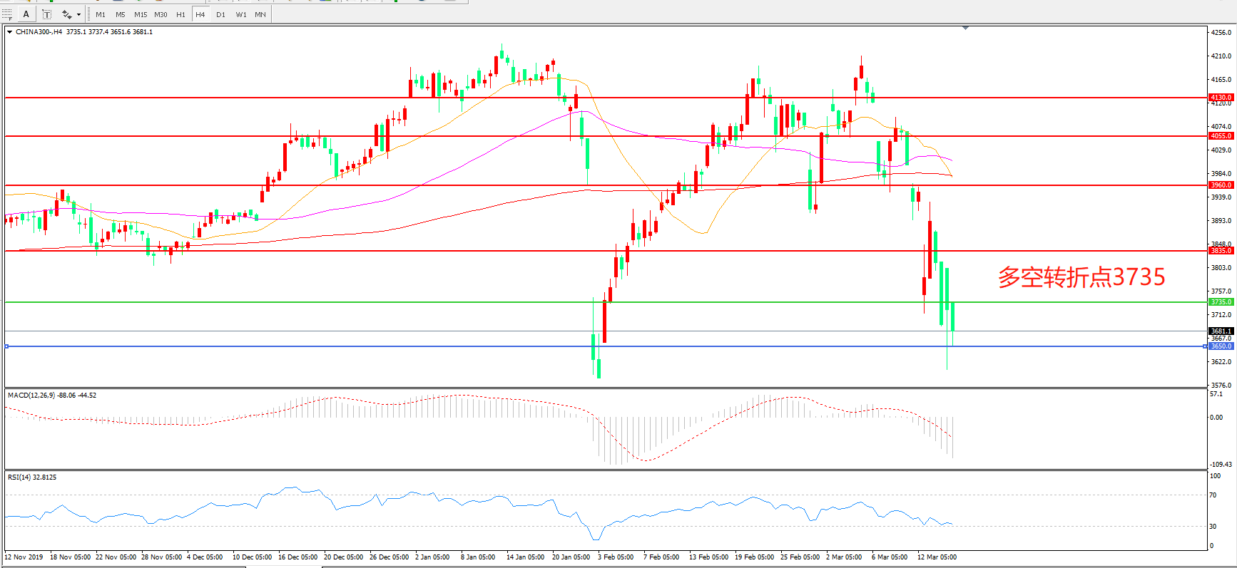 4小时图看,沪深300低开低走,整体表现低迷,均线系统走平,MACD绿柱增加,RSI指标走平,日内延续下行概率较大。