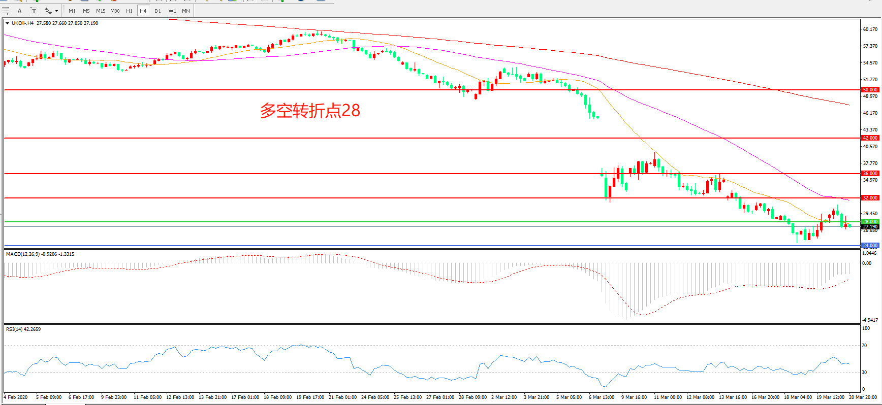 4小时图看,布油一度以24美元为支撑小幅反弹,整体有止跌迹象,但均线系统仍呈空头排列,MACD绿柱缩短,RSI指标走平,日内延续震荡概率较大。