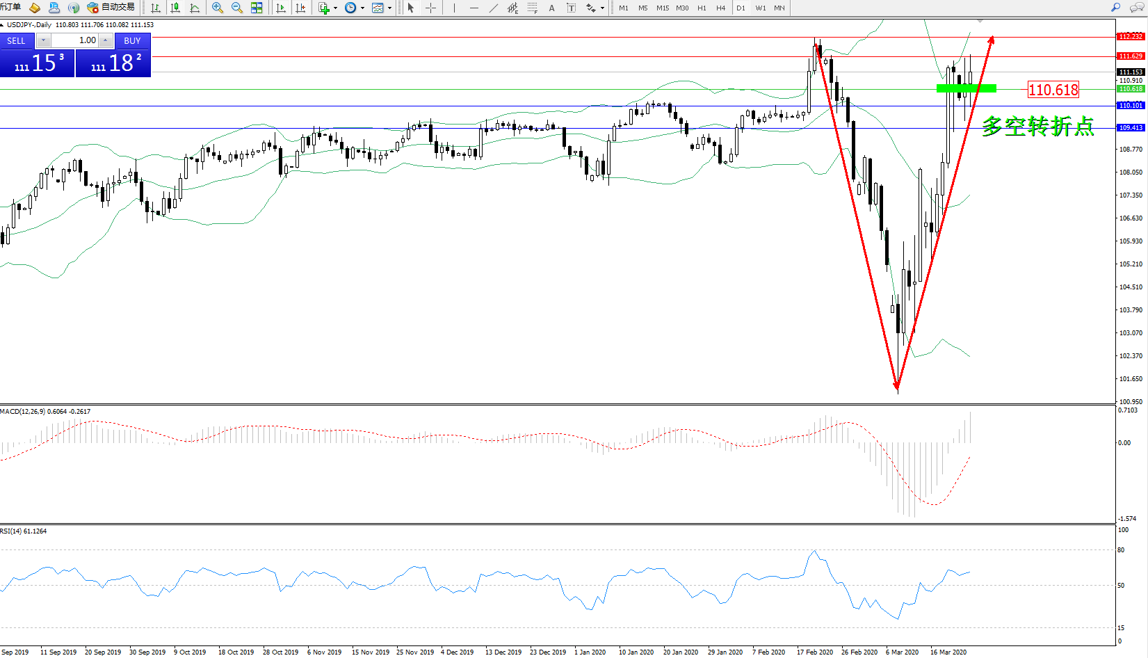 交易策略:110.618上方看涨,目标111.629112.232