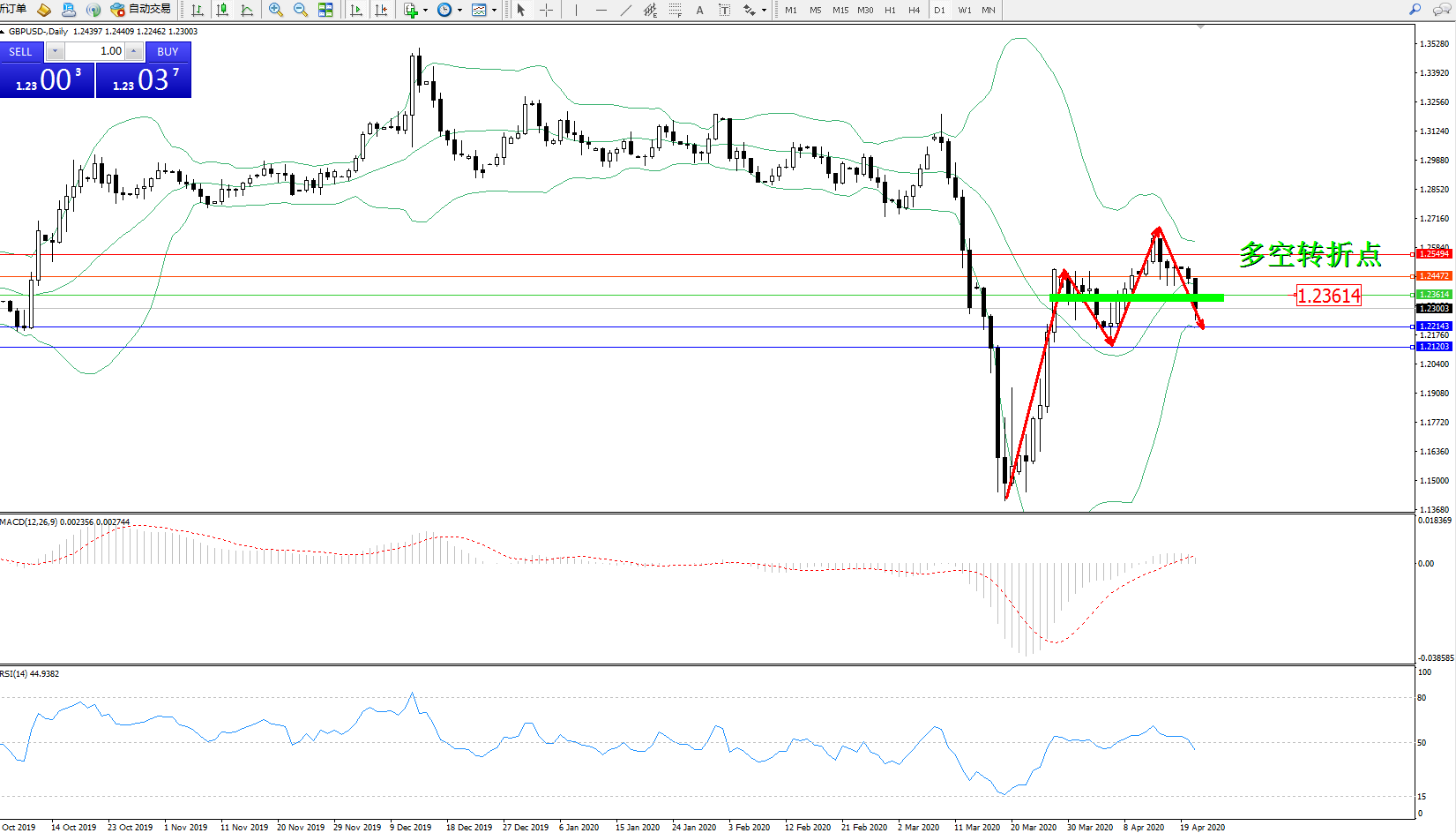 交易策略:1.23614下方看跌,目标:1.22143、1.21203