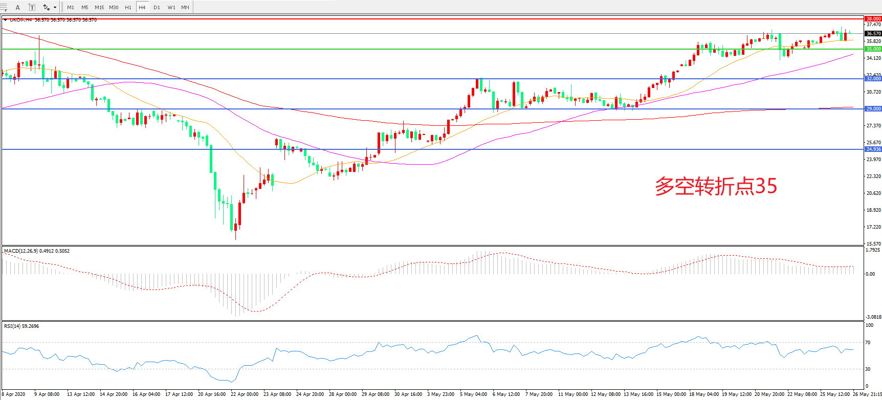 4小时图看,油价延续高位震荡,以35美元为依托进行短期整理,均线系统呈多头排列,MACD红柱减少,RSI指标向上,日内延续震荡概率较大。