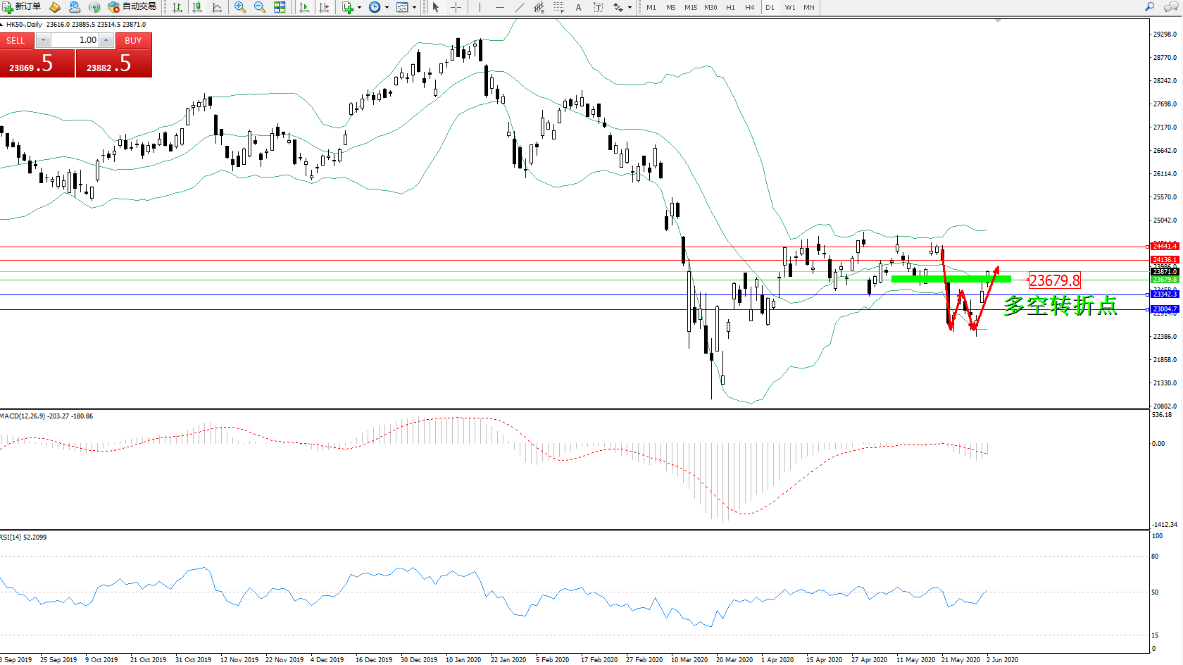 香港恒生指数6月2日(周二)收盘上涨263.42点,涨幅1.11%,报23995.94点;连续三日反弹,港股三大指数均收涨,大市成交量为1084.67亿港元,南下资金净流入15.5亿港元。风电股板块领衔上涨,华电福新获提私有化飙涨60%,带动大唐新能源、龙源电力走高;医疗设备股、香港零售股皆现普涨行情,国美零售大涨19%,创维集团涨7%;电信股、建材水泥股跌幅明显,中国电信跌超3%。恒指国指成份股大多上涨,港交所涨近2%股价逼近历史新高。 港股预托证券个别发展,预料大市早段缺乏方向。内地上月采购经理指数表现向好,加强市场对内地经济前景信心。港股急剧反弹,蓝筹股近乎全线上升,指数突破多条移动平均线水平,大市成交保持畅旺。