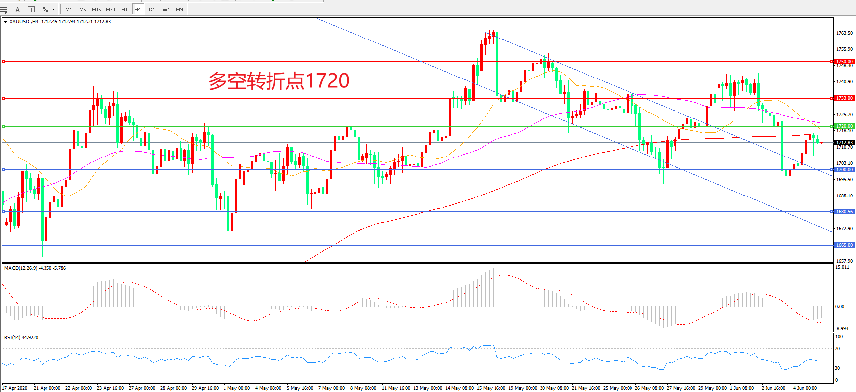 周四(6月5日),美国低迷的贸易逆差数据盖过了略微乐观的就业数据和对经济复苏的乐观情绪,金价回升逾1%,收报1713.82美元/盎司。但整体而言,黄金仍未摆脱震荡格局,恐慌指数VIX交投于三个月低位,显示避险情绪对黄金依旧不利。
