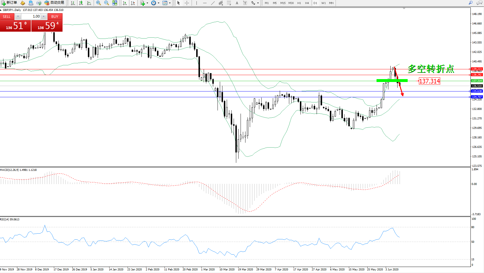 技术点评:多头动力延续布林带指标上轨附近持续拉升后,高位遇阻出现回撤下行走势,布林带指标呈张口走势后开始有收口走势迹象,MACD指标处于0轴线上方多头区域高位出现空头下行态势,RSI指标处于50均衡线上方多头区域空头动力强势下探;