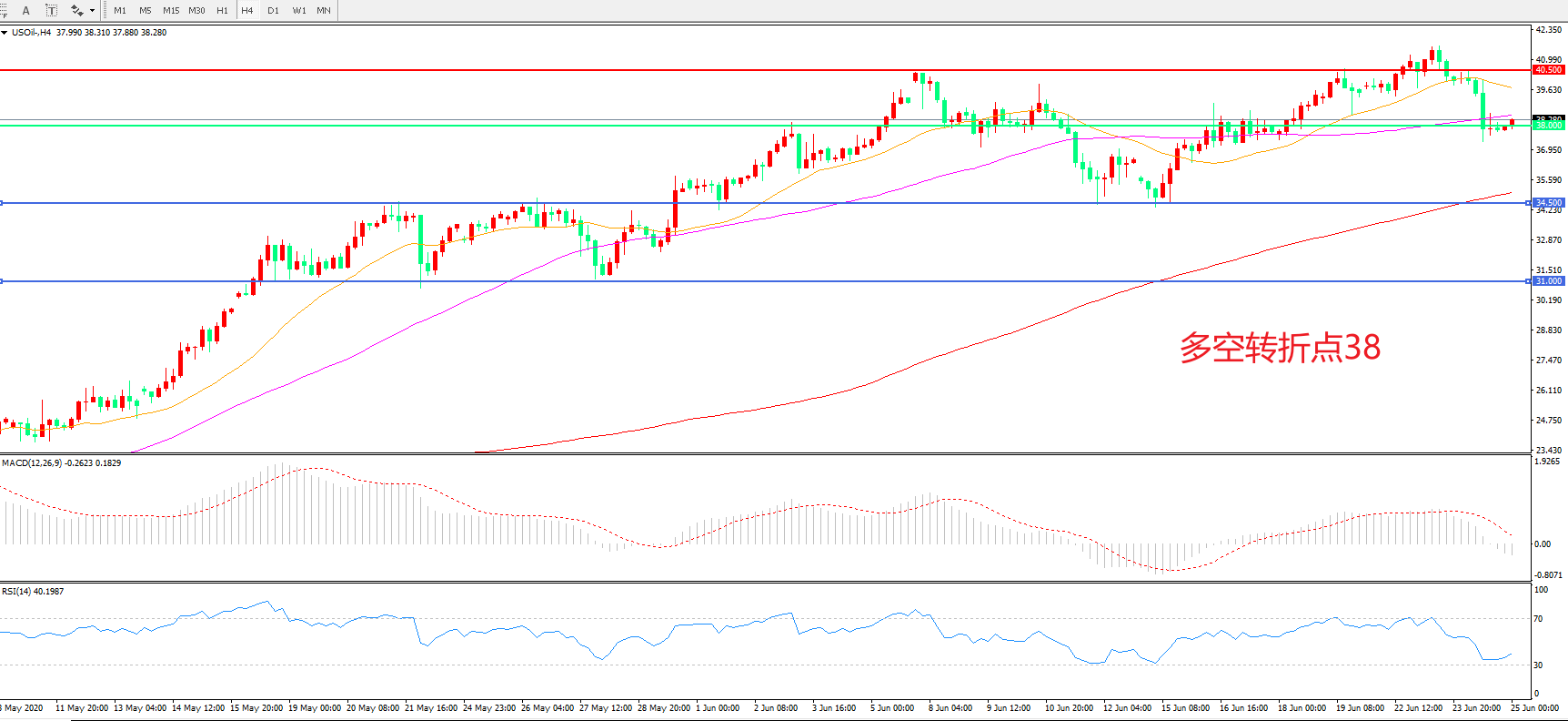 周三(6月24日),因EIA原油库存再创新高,美国多州新增病例反弹,疫情二次爆发威胁了需求前景,美国WTI原油大幅下挫,收报37.9美元/桶。根据美国能源信息署公布的数据,美国除却战略储备的商业原油库存增加144.2万桶至5.407亿桶,美国国内原油产量连续11周录得下滑后首次录得增长,美油短线下挫,跌幅超过3%。