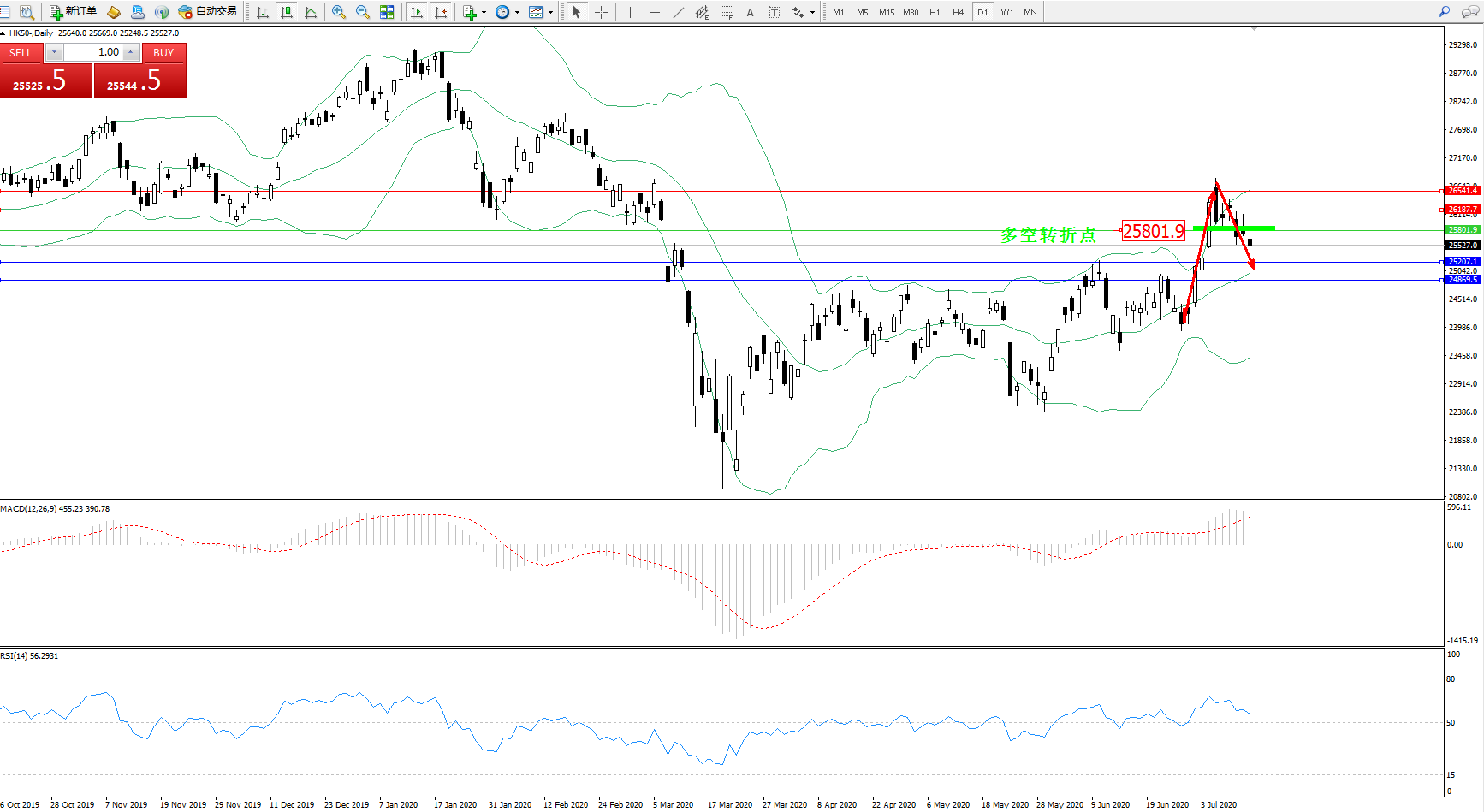 技术点评:多头动力强势拉升上扬后遇阻回撤,高位空头动力强劲,即将触及布林带指标中轨附近节点,且有继续回撤态势,布林带指标呈张口走势后开始有收口迹象,MACD指标处于0轴线上方多头区域高位持续整理平移中,RSI指标处于多头区域高位弱势震荡开始回撤下移中;