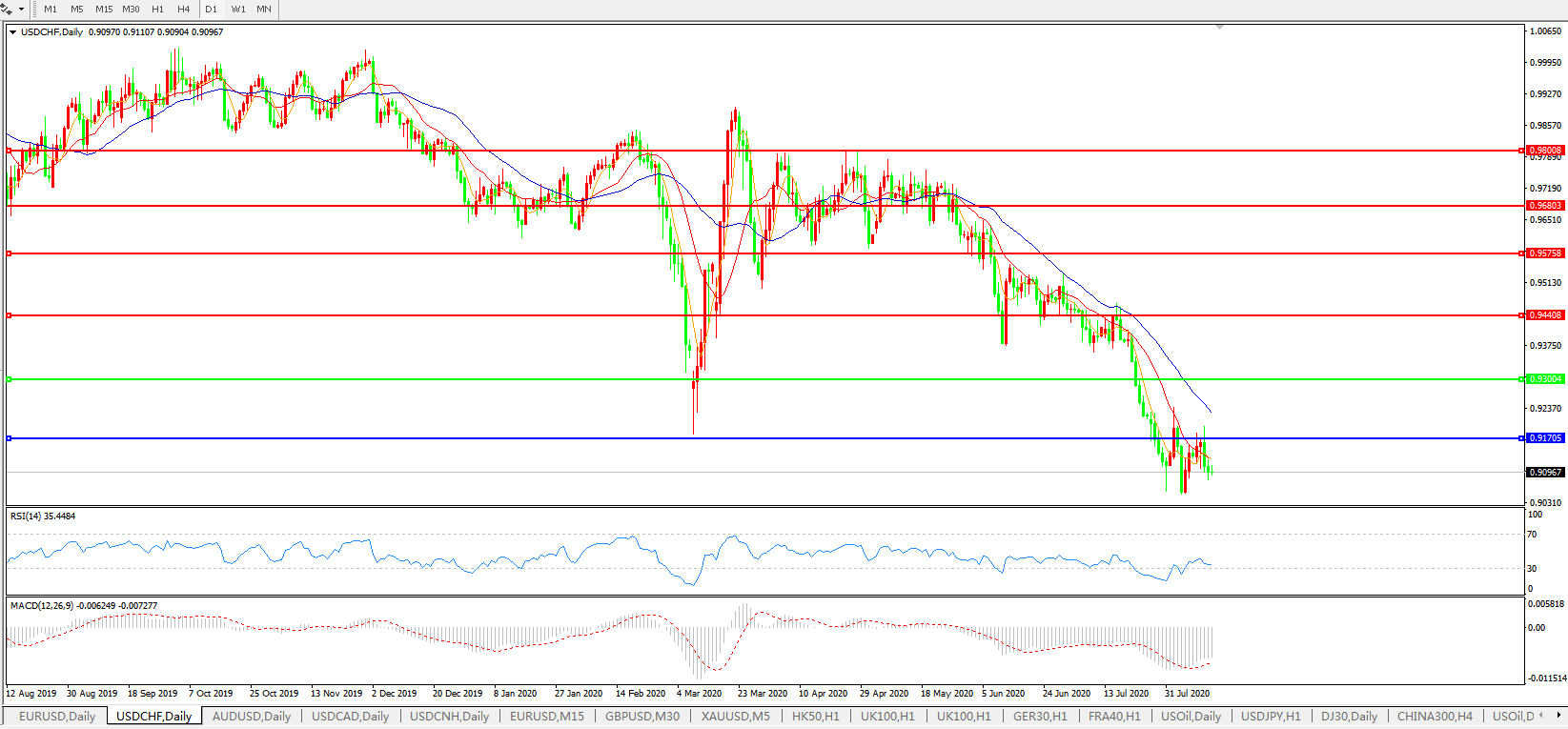 技术面简析:日线图均线维持空头排列,汇价再度回归弱势,MACD于0轴下方开始拐头且量能0轴下开始缩量,RSI反弹后再度走弱,预计短期汇价大概率将进一步下行。