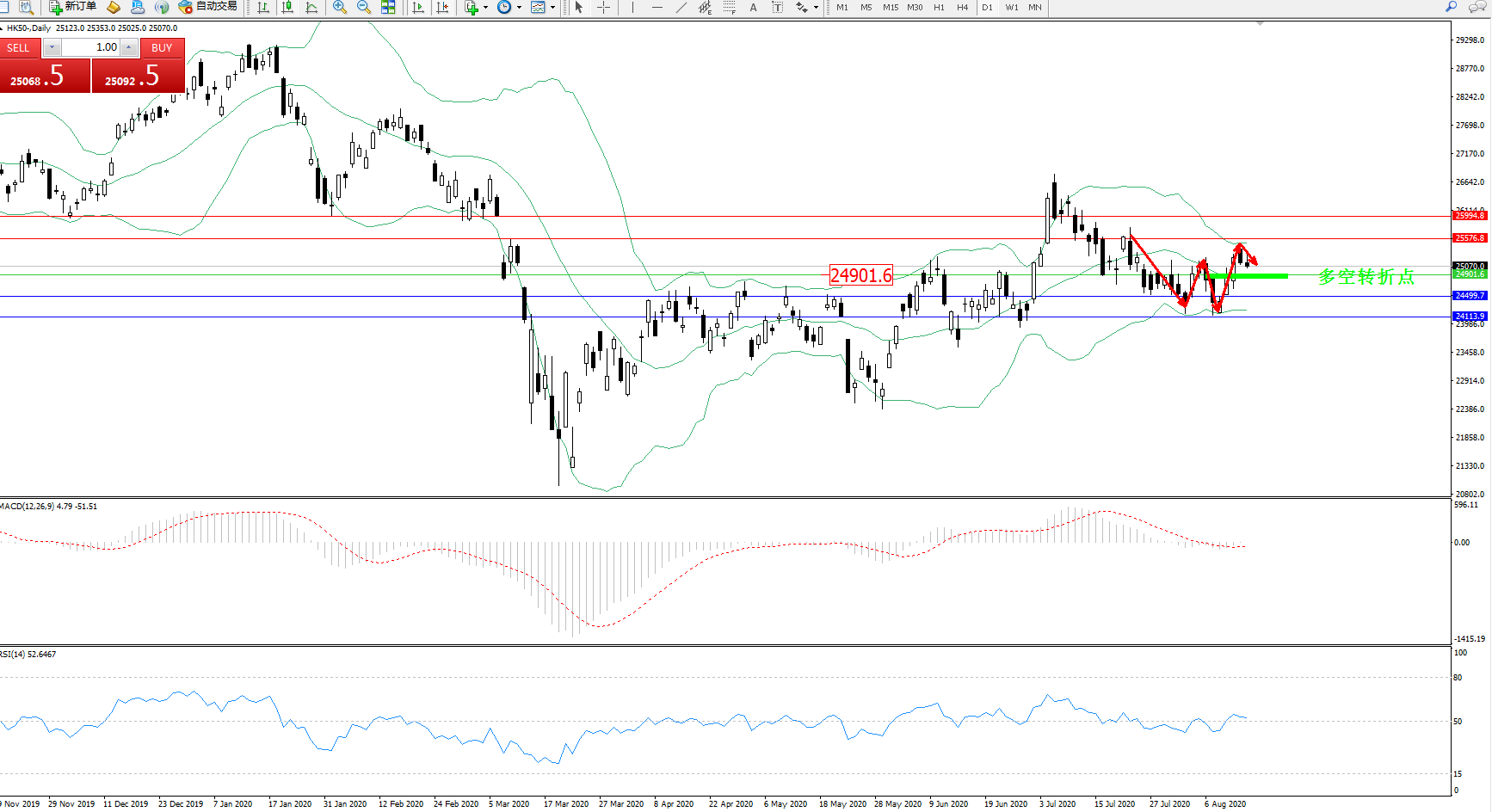 香港恒生指数8月14日(周五)收盘下跌47.66点,跌幅0.19%,报25183.01点;港股三大指数收盘涨跌不一,恒指午后冲高回落明显,市场情绪仍旧偏弱。内险股、内银股午后拉升撑市,但持续性不强尾盘稍有回落;电信股延续强势行情,中国电信大涨近7%,两日累升18%;今日南下资金净流入35.47亿港元,大市成交额为1033亿港元。 香港特区卫生防护中心传染病处主任张竹君表示,香港新增新冠肺炎确诊病例48例,单日新增连续12天少于100例。其中本地确诊46例。目前,香港累计确诊4361例。香港旅游发展局(旅发局)8月14日公布,7月初步访港旅客数字约20600人次,每日平均约660人次,按年下跌99.6%。数据显示,内地访港旅客按年减99.9%,有5709人次。至于非内地旅客,7月份录得14859人次,按年减98.6%。