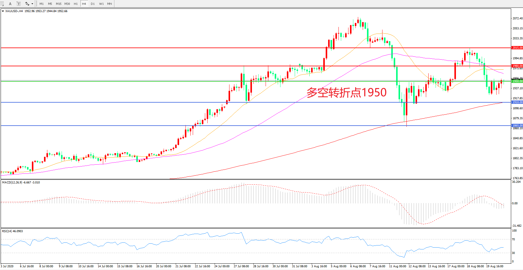 周四(8月20日),美国初请失业数据重回100万上方引发了一定的担忧,同时美国新一轮刺激法案依然陷于僵局,这令市场避险情绪有所升温,现货黄金自低位震荡反弹,收报1949.07美元/盎司。近期美元反弹成为金价下行最大的压力,市场将从不断公布数据中来重新评估经济复苏形势,来为美元与黄金的中期预判做参考。