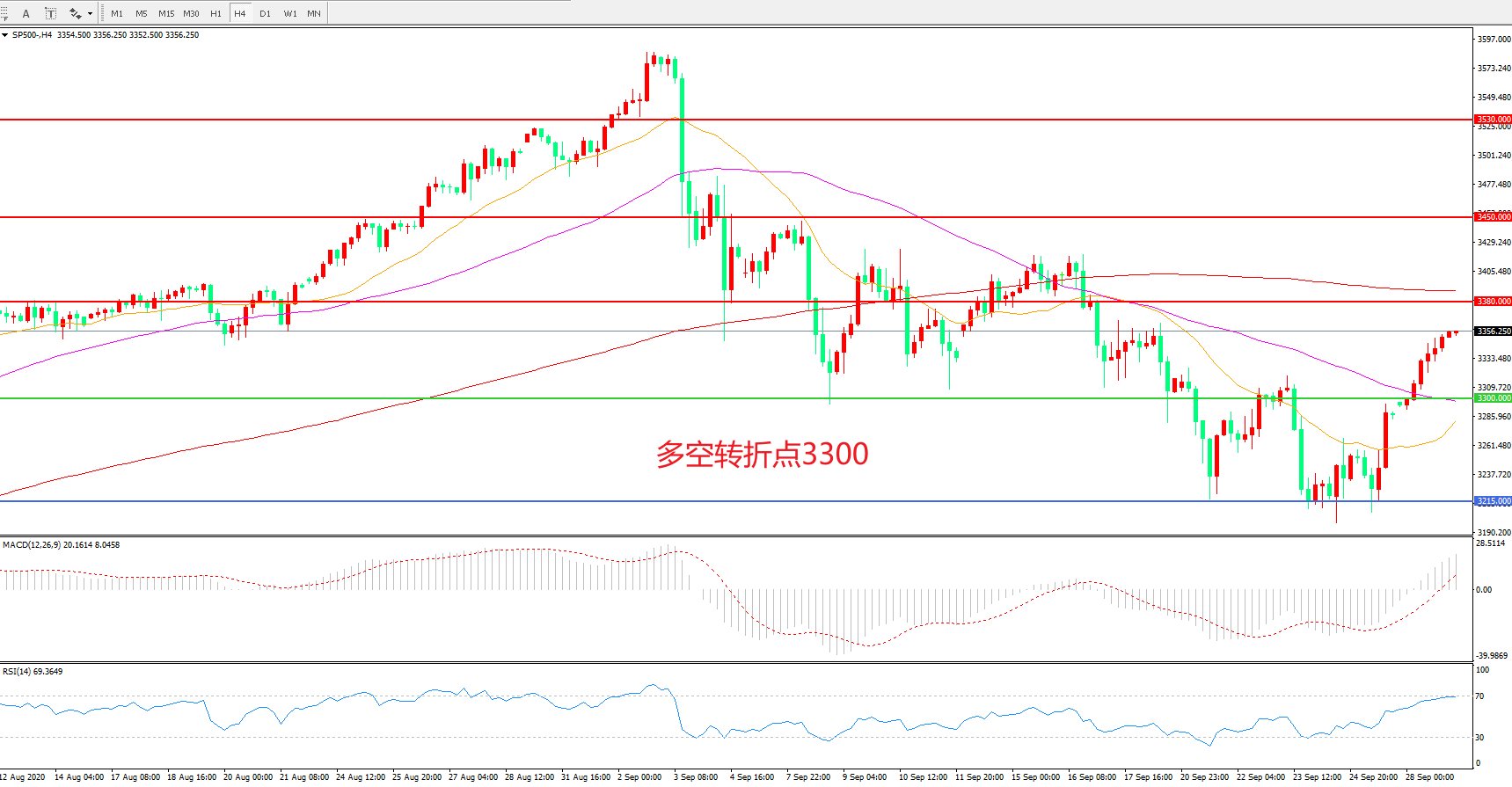 4小时图看,标普500以3300为依托震荡反弹,短期走势回暖,均线系统系统有拐头迹象,MACD红柱增加,RSI指标向上,日内震荡上行概率较大。